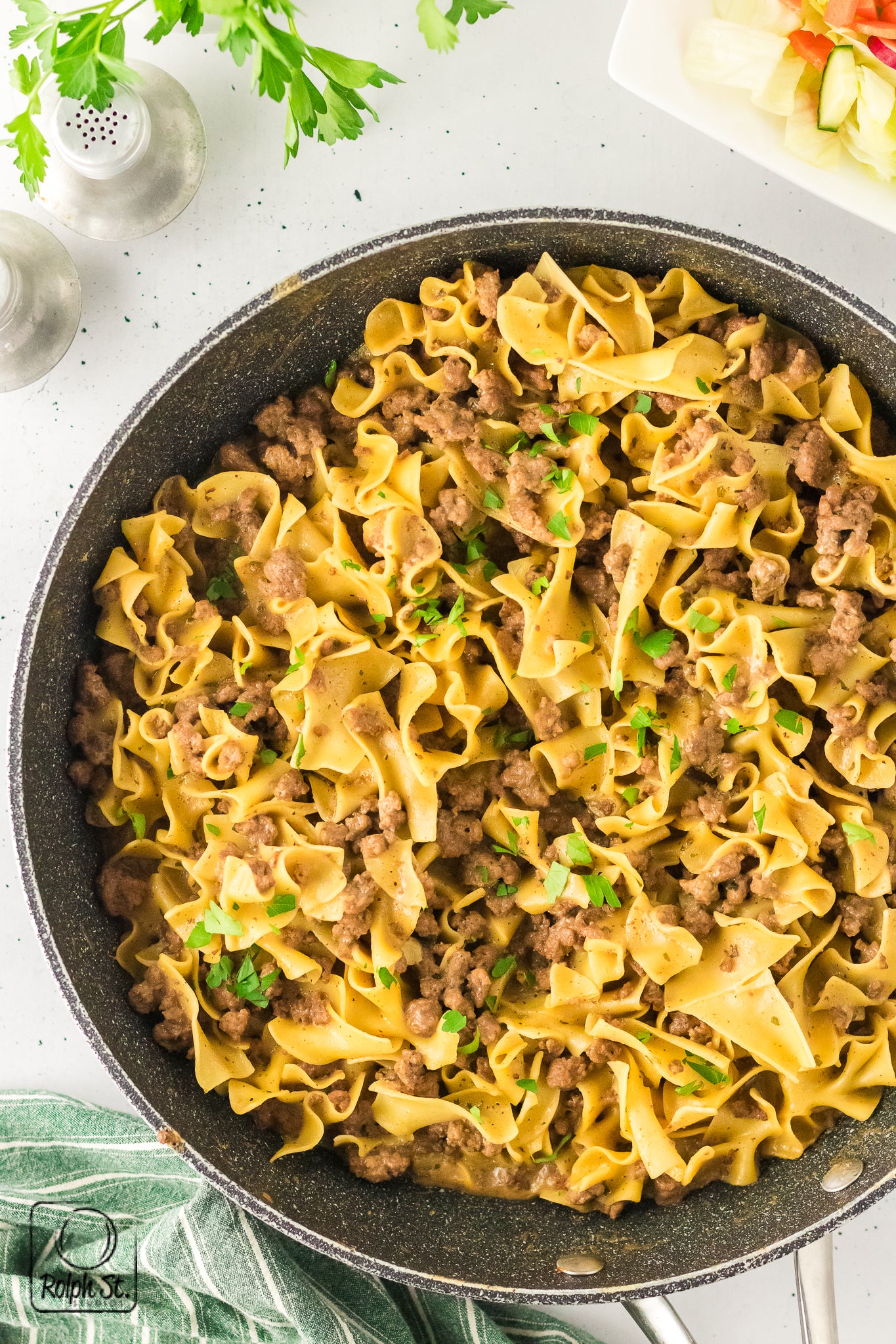 Beef Noodle Hamburger Helper is a rich, comforting one-pan meal that delivers all the flavour of classic stroganoff without any of the fuss. The egg noodles soften right in the same skillet, soaking up a creamy, velvety sauce that clings to every bite. The broth, milk, and seasonings come together into a thick, deeply flavourful gravy that tastes like it simmered for hours. Fresh parsley adds a bright pop of colour against the creamy noodles and browned beef. The final result is a hearty, satisfying and incredibly tasty dish that tastes so much better that anything that comes from a box yet it comes together with the same weeknight ease.