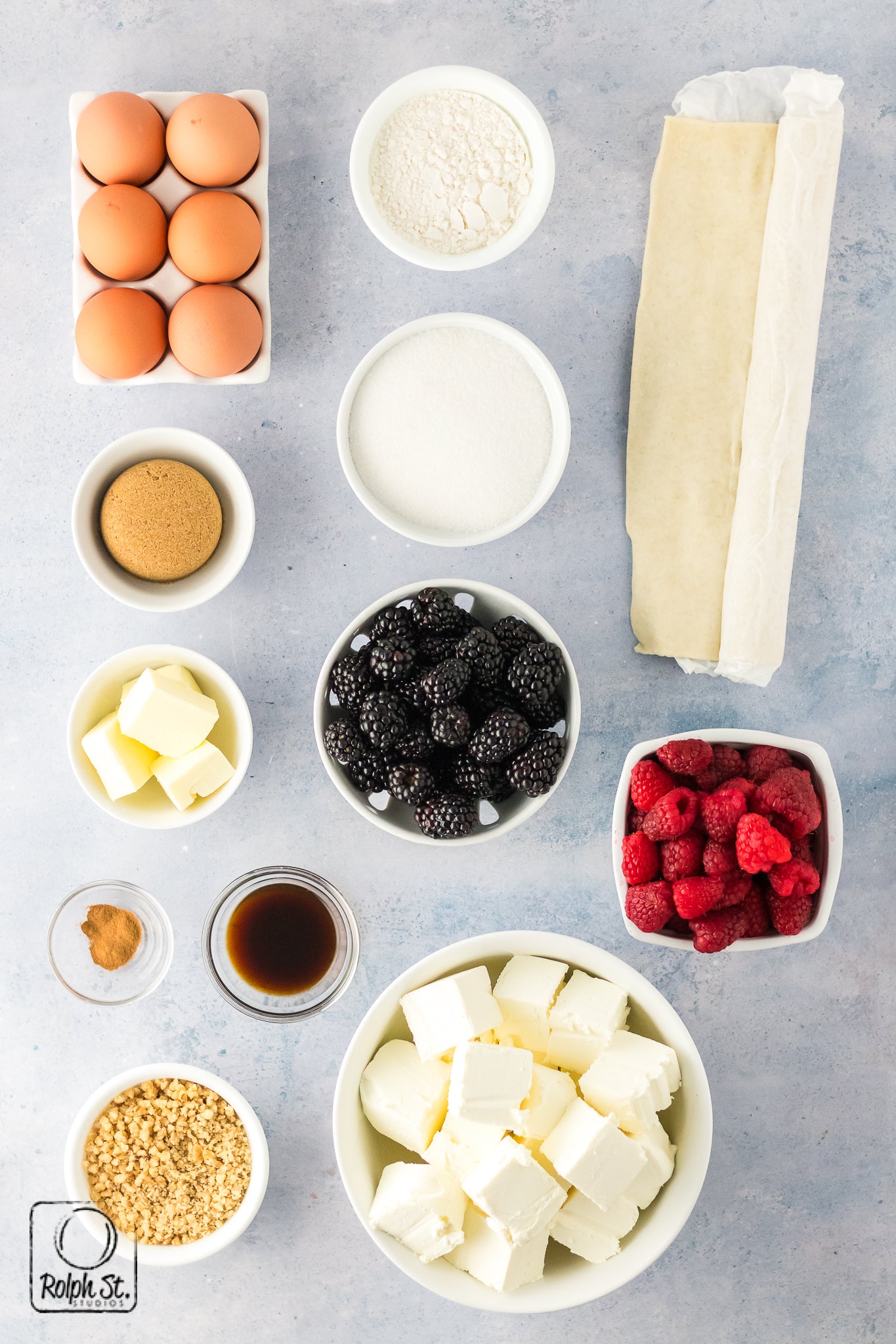 Main ingredients: puff pastry, cream cheese, eggs, granulated sugar, brown sugar, butter, vanilla extract, ground pecans, flour
