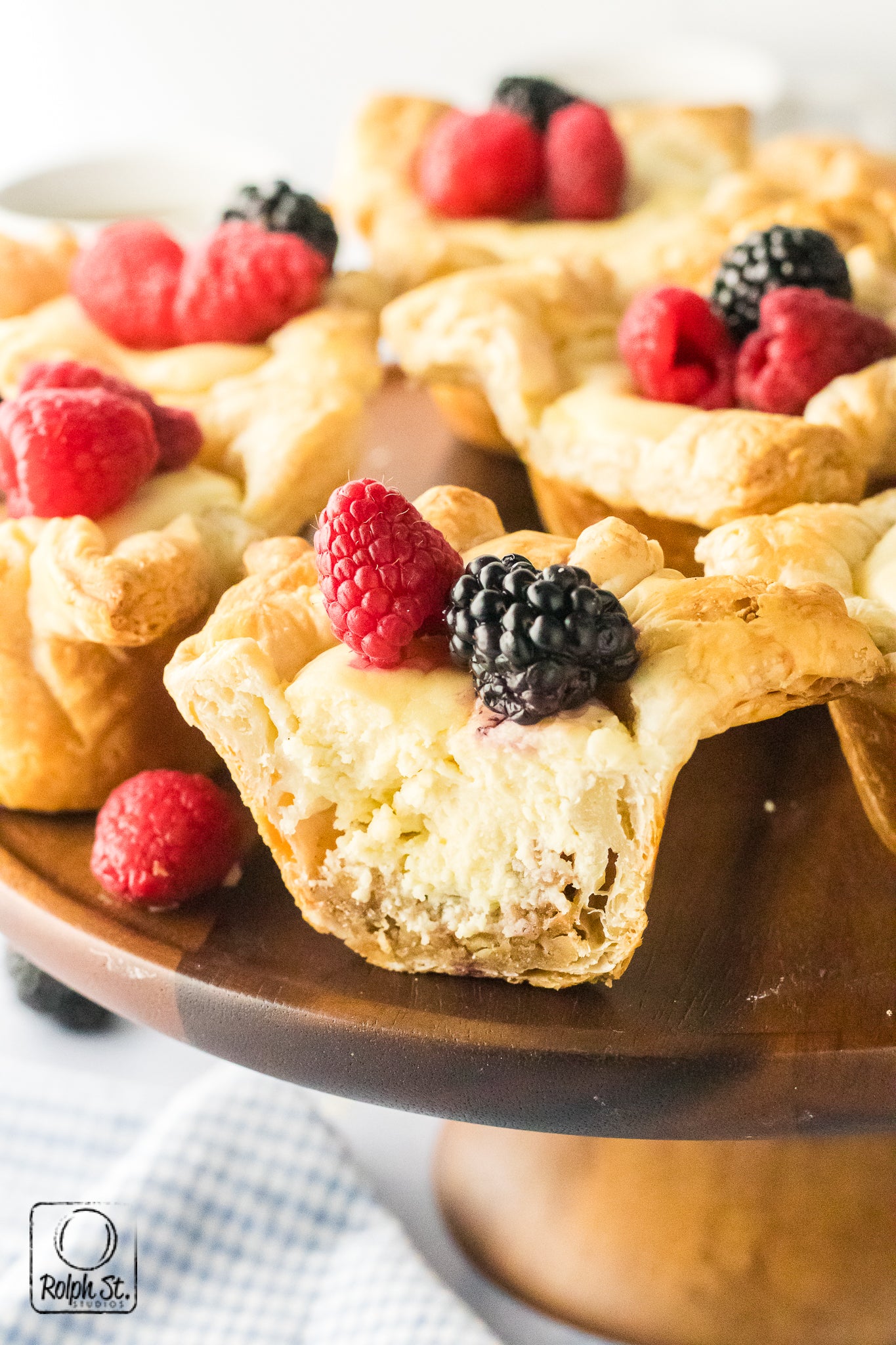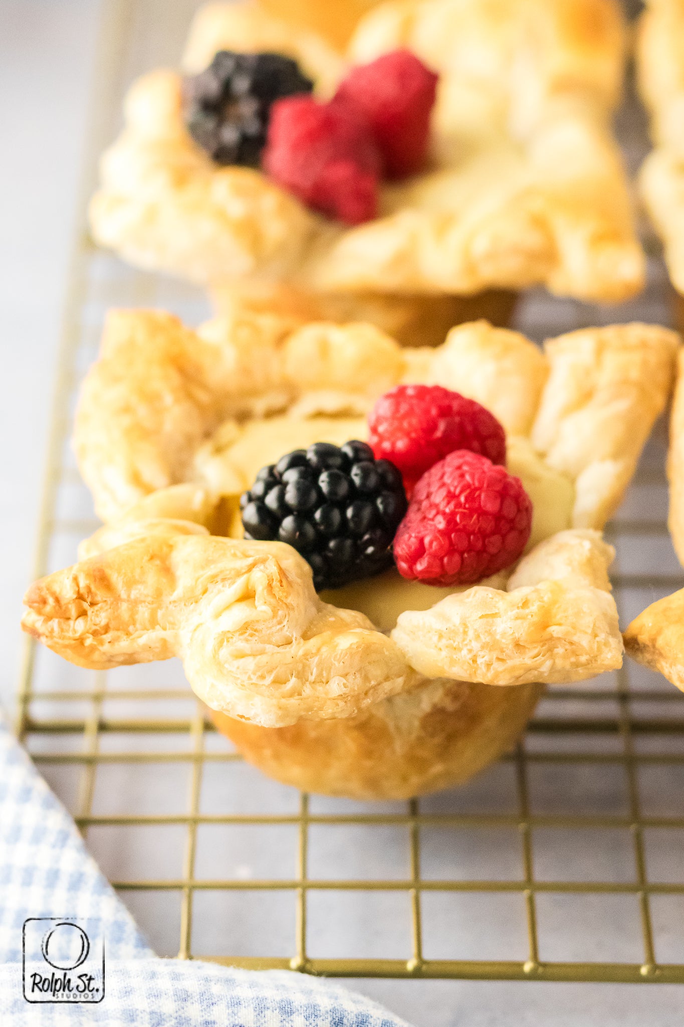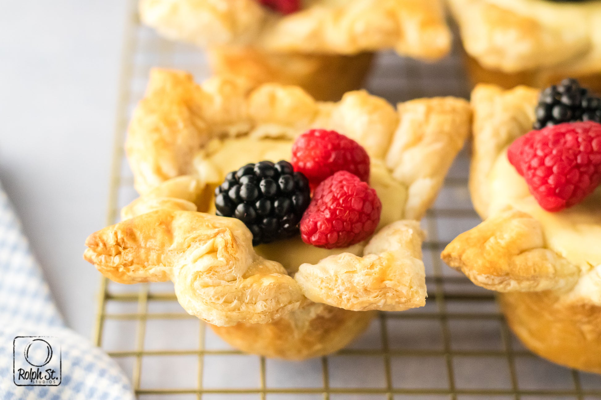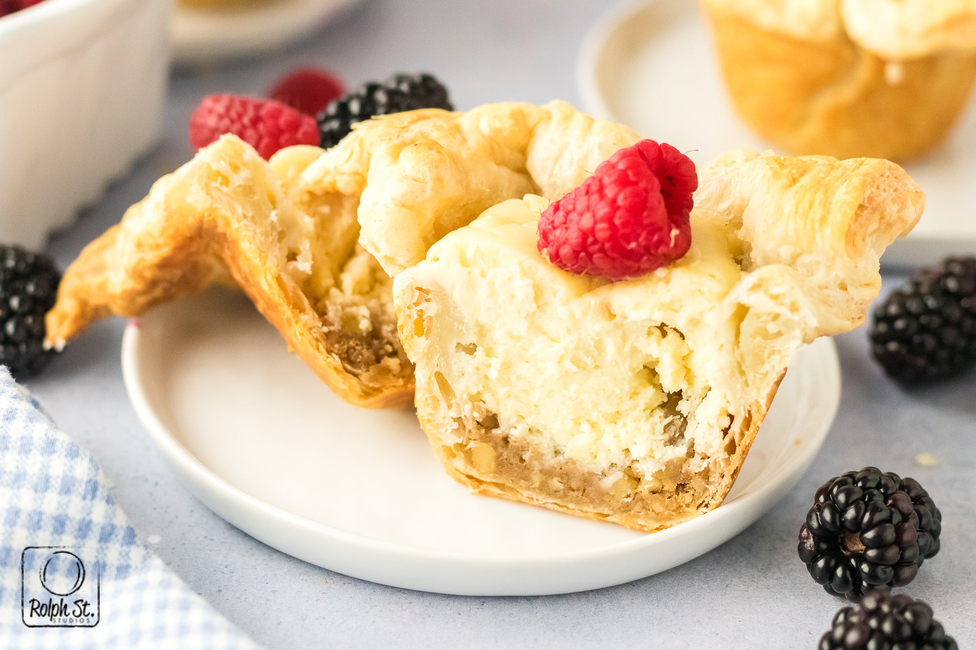 Cheese Crowns are golden, elegant little pastries with crisp, flaky corners that fan out like regal points. Inside the base of buttery pecan streusel adds a sweet, nutty crunch that contrasts beautifully with the smooth, creamy cheesecake filling. As they bake, the cream cheese and pastry puffs dramatically before settling into a silky and rich dessert. Each crown holds its shape with a gorgeous balance of textures: crisp pastry, crumbly streusel and smooth cheesecake. Top each one with fresh fruit for a dessert that is fit for a king.