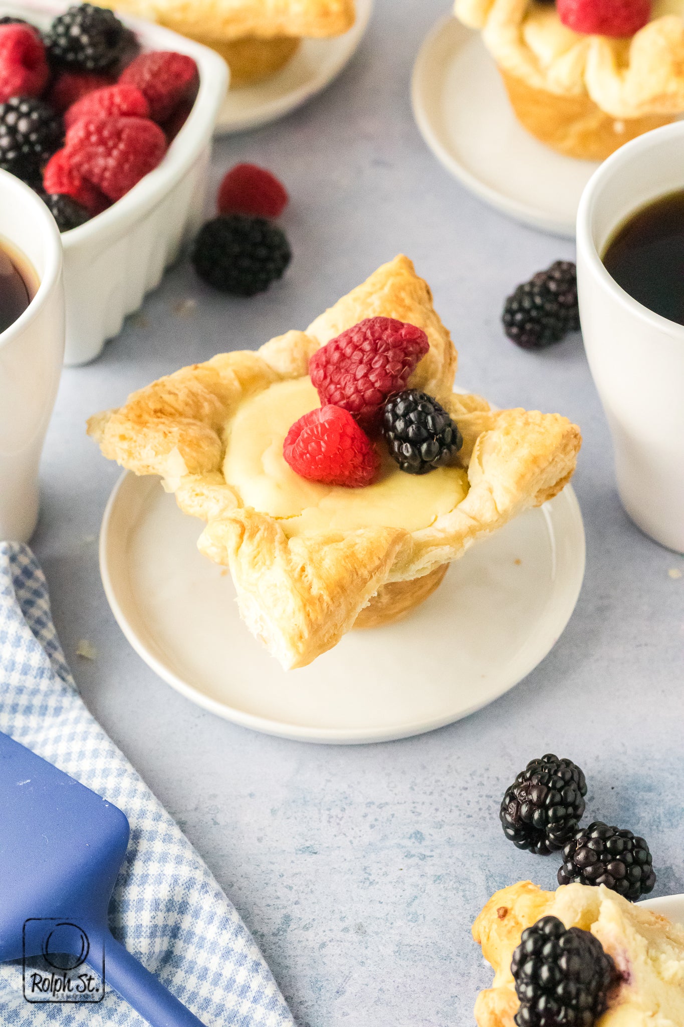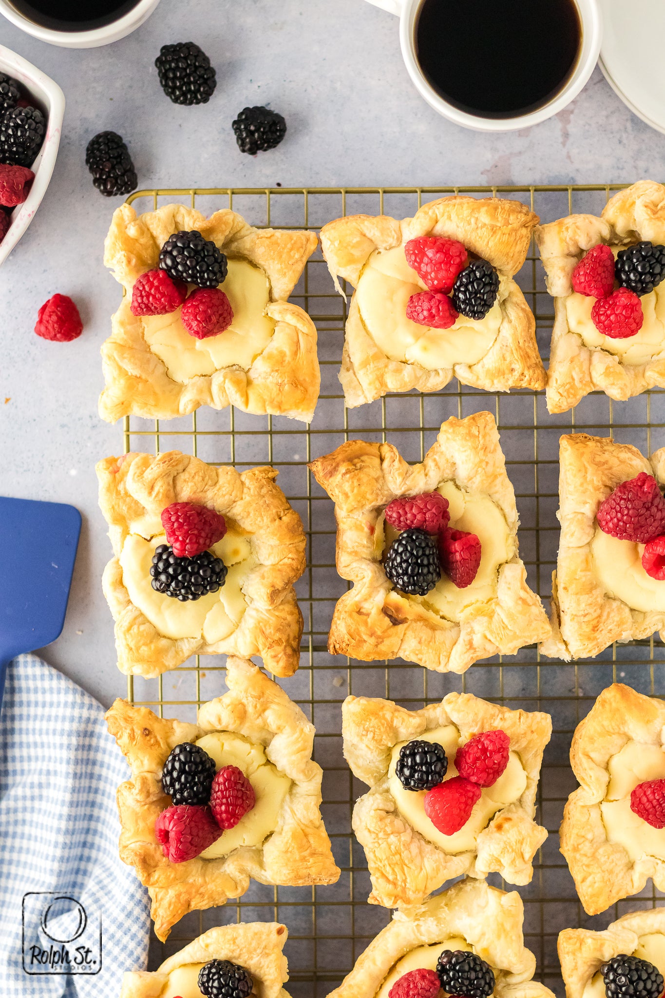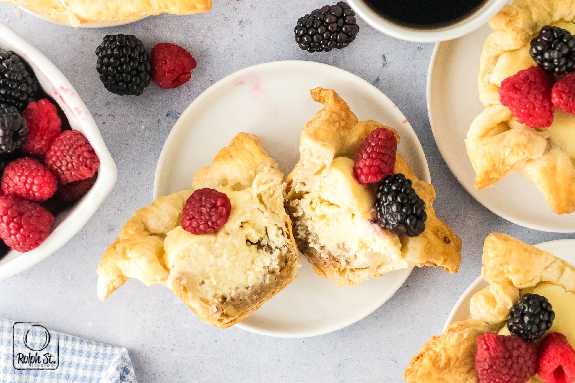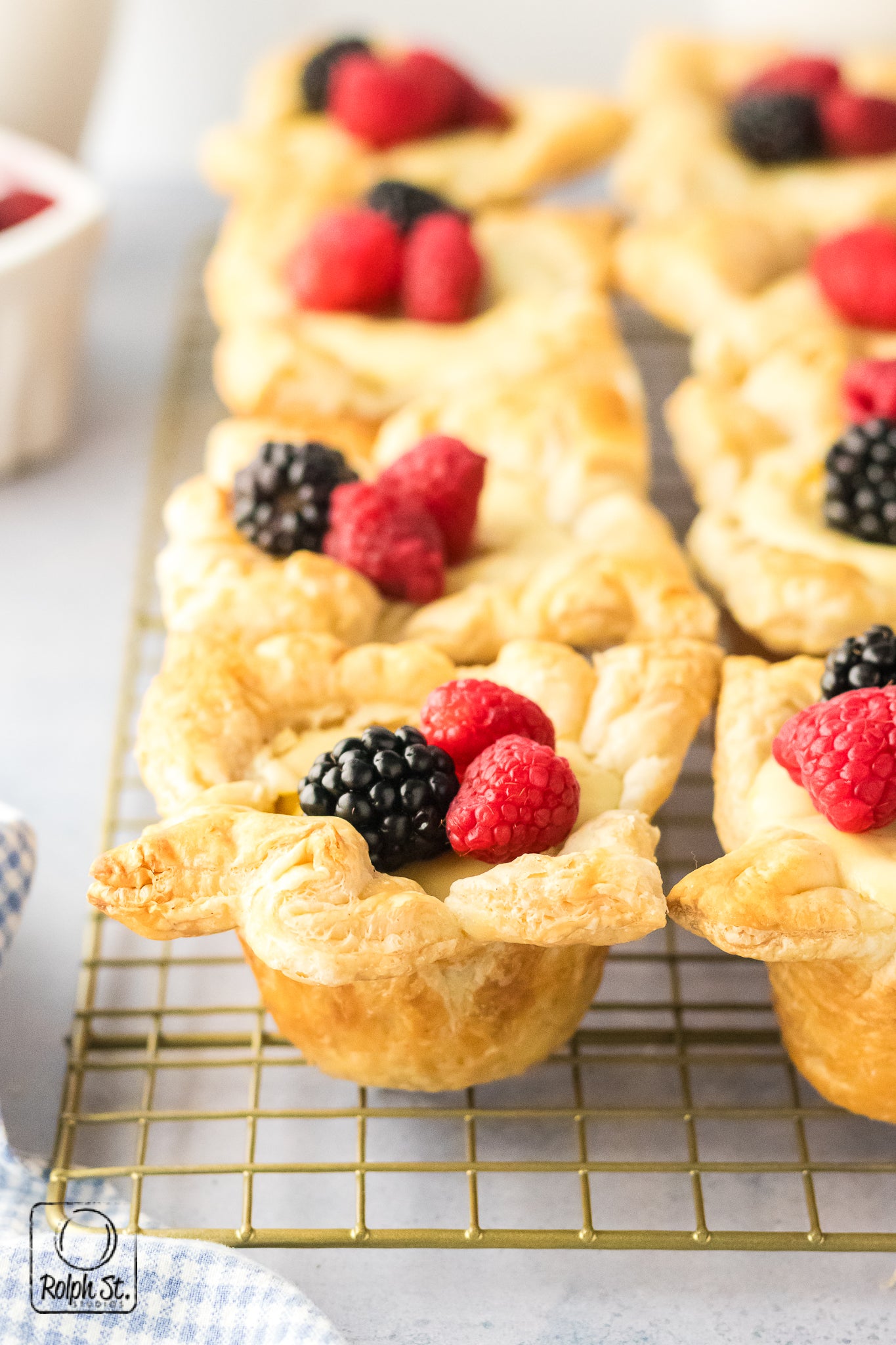 Cheese Crowns are golden, elegant little pastries with crisp, flaky corners that fan out like regal points. Inside the base of buttery pecan streusel adds a sweet, nutty crunch that contrasts beautifully with the smooth, creamy cheesecake filling. As they bake, the cream cheese and pastry puffs dramatically before settling into a silky and rich dessert. Each crown holds its shape with a gorgeous balance of textures: crisp pastry, crumbly streusel and smooth cheesecake. Top each one with fresh fruit for a dessert that is fit for a king.