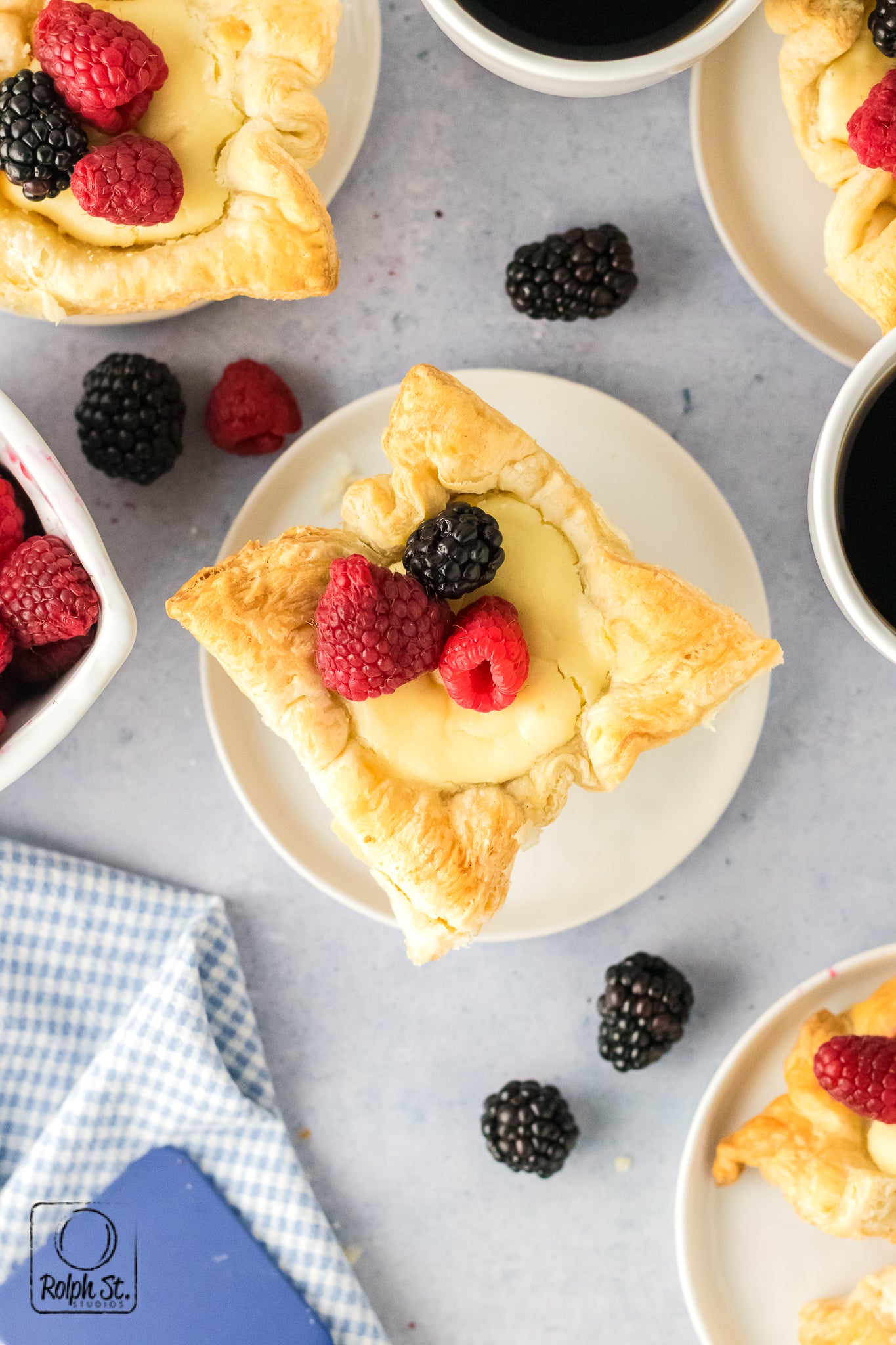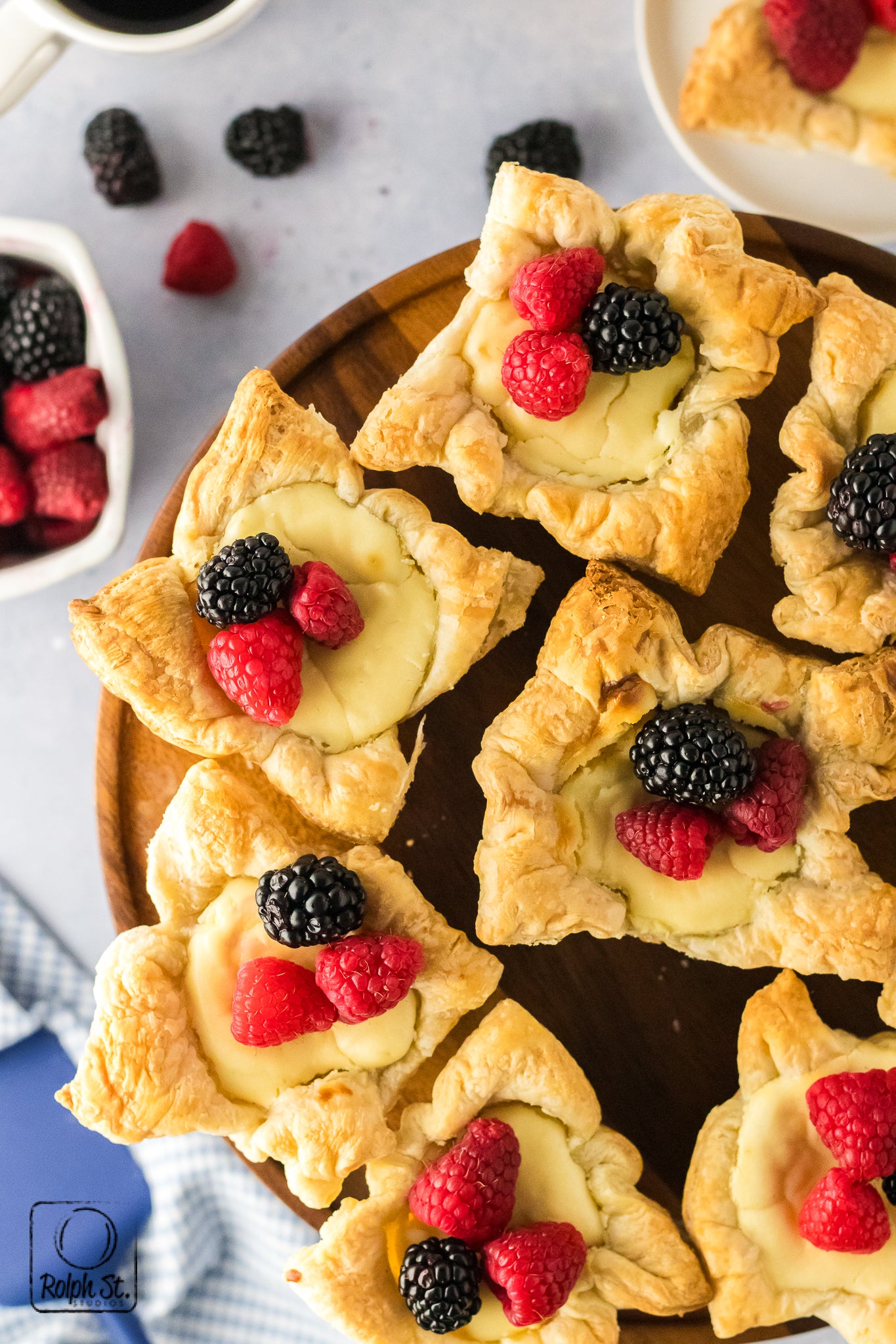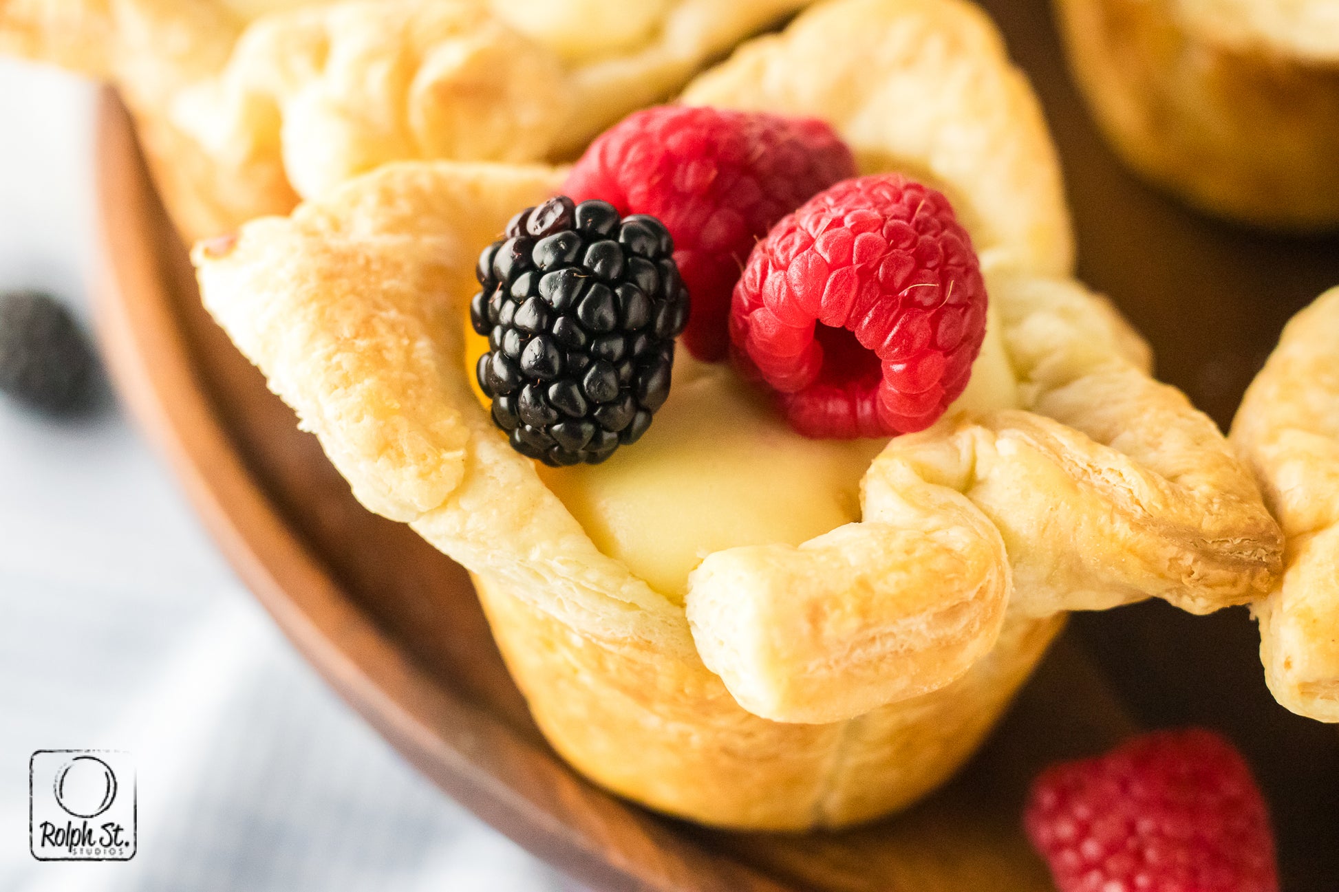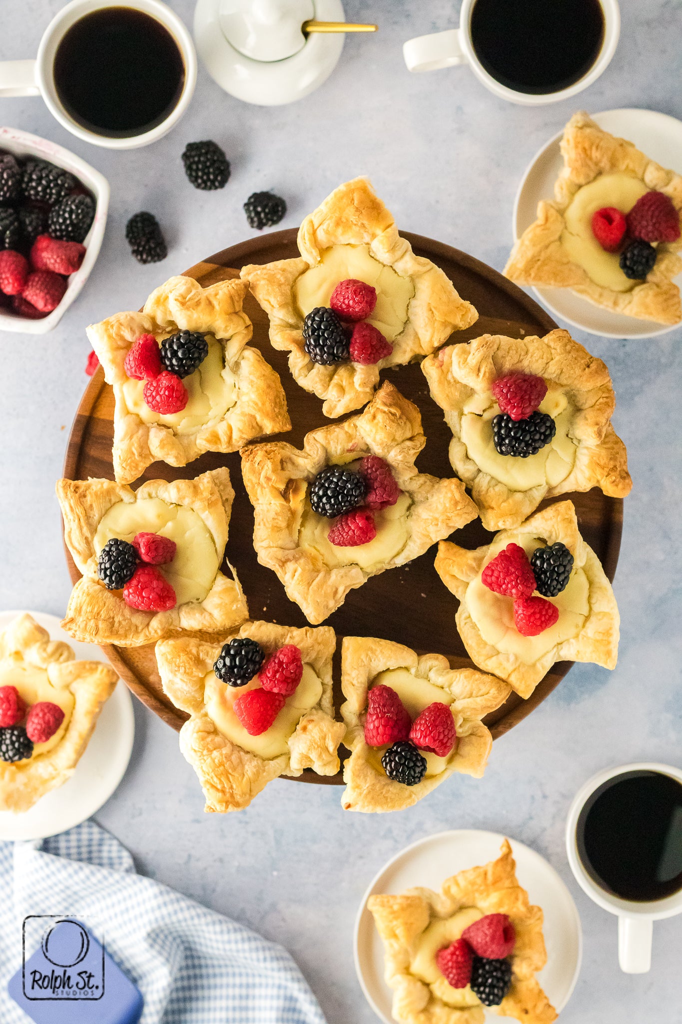 Cheese Crowns are golden, elegant little pastries with crisp, flaky corners that fan out like regal points. Inside the base of buttery pecan streusel adds a sweet, nutty crunch that contrasts beautifully with the smooth, creamy cheesecake filling. As they bake, the cream cheese and pastry puffs dramatically before settling into a silky and rich dessert. Each crown holds its shape with a gorgeous balance of textures: crisp pastry, crumbly streusel and smooth cheesecake. Top each one with fresh fruit for a dessert that is fit for a king.