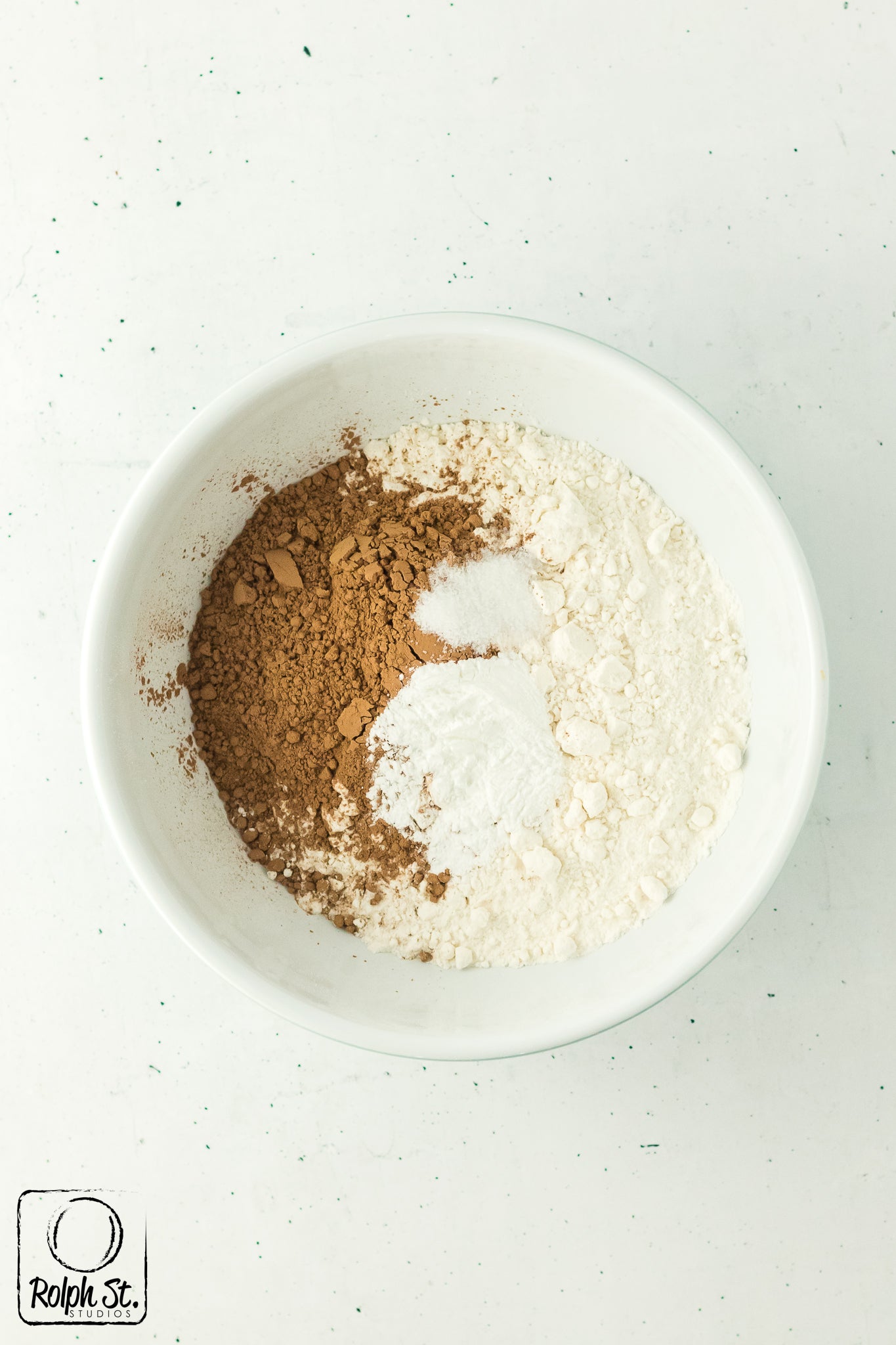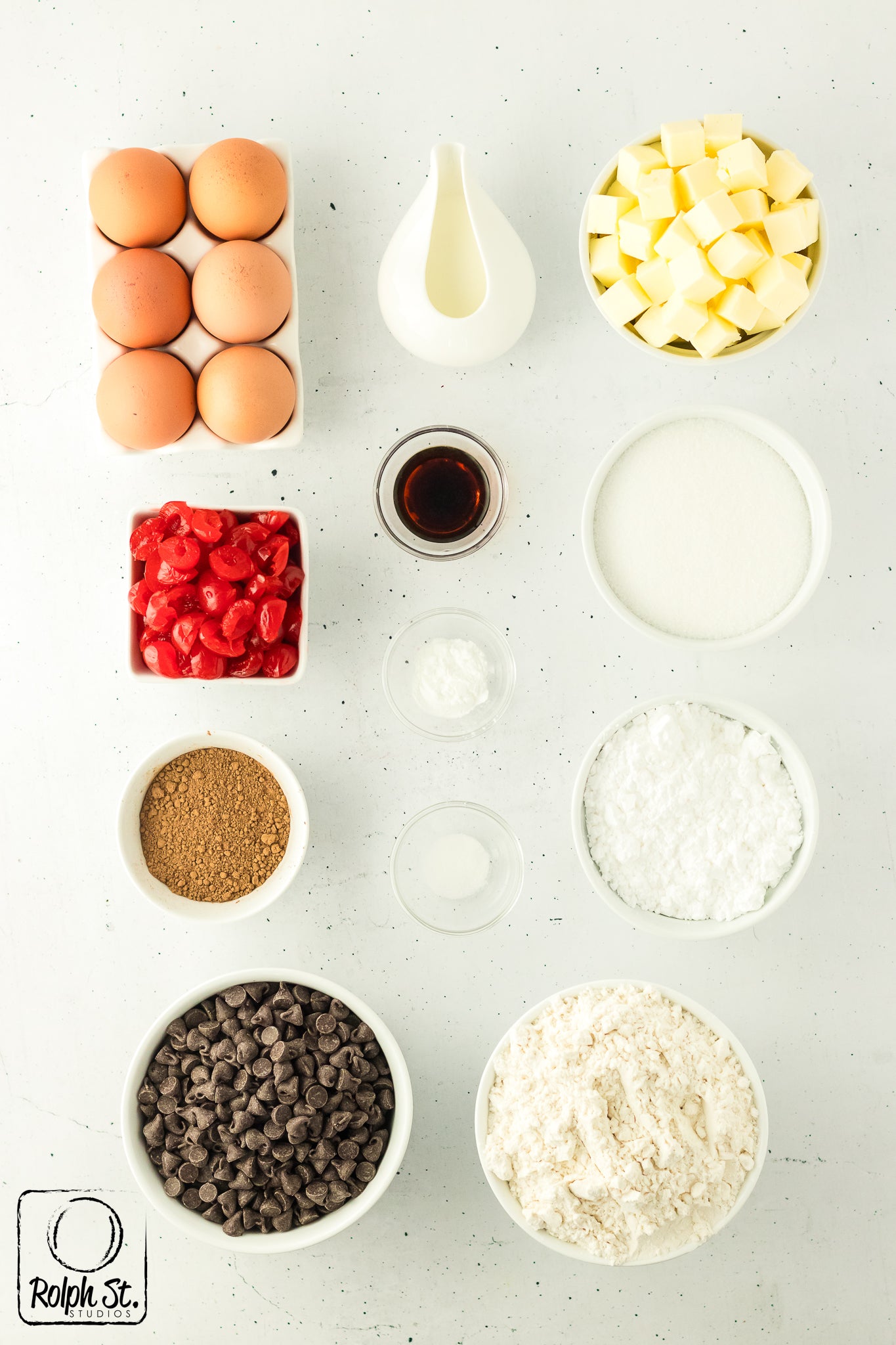 Main ingredients: flour, eggs, butter, sugar, powdered sugar, cocoa powder, maraschino cherries, vanilla