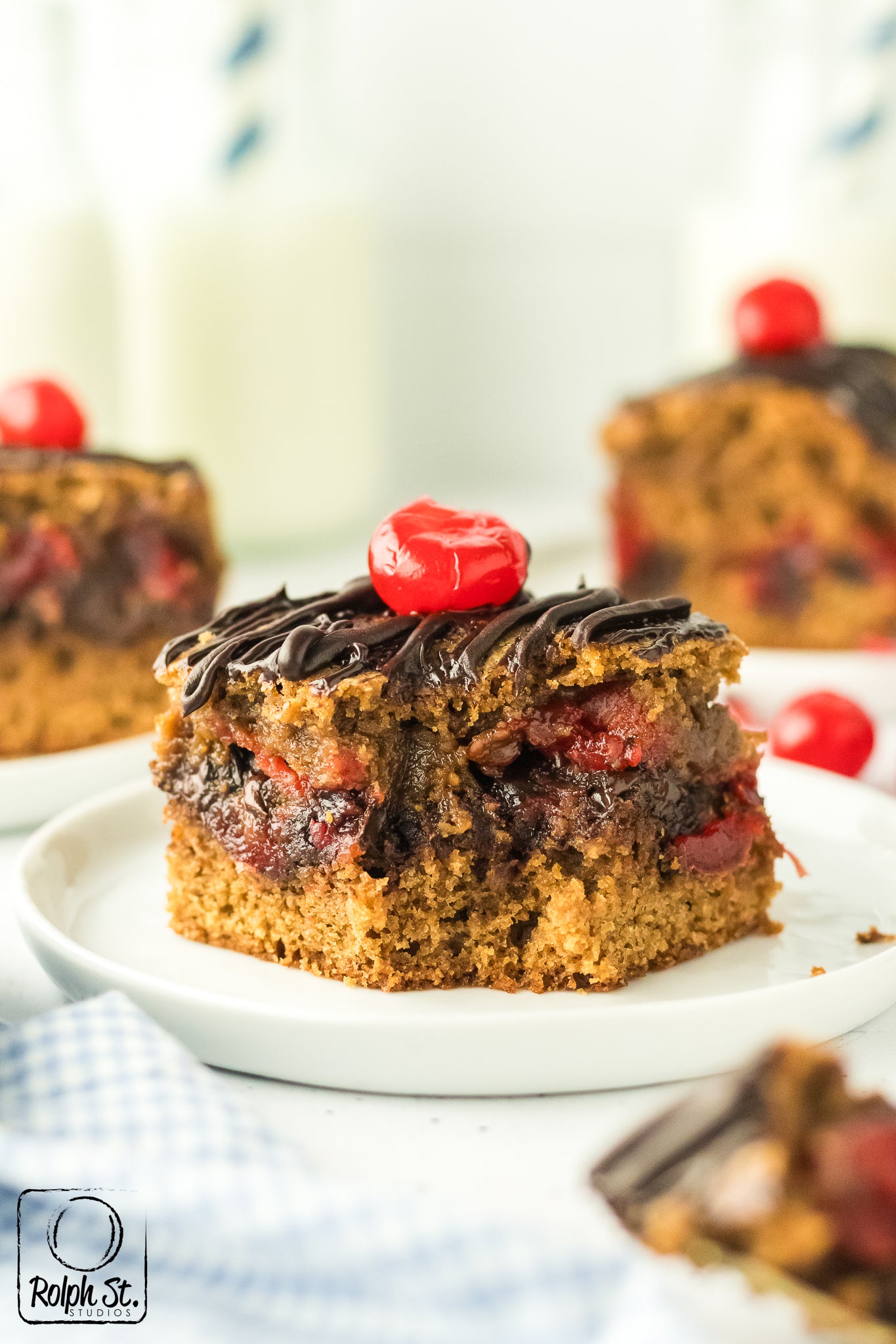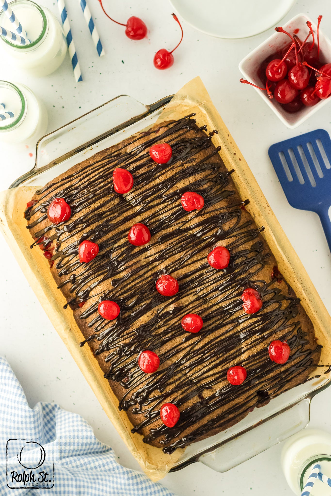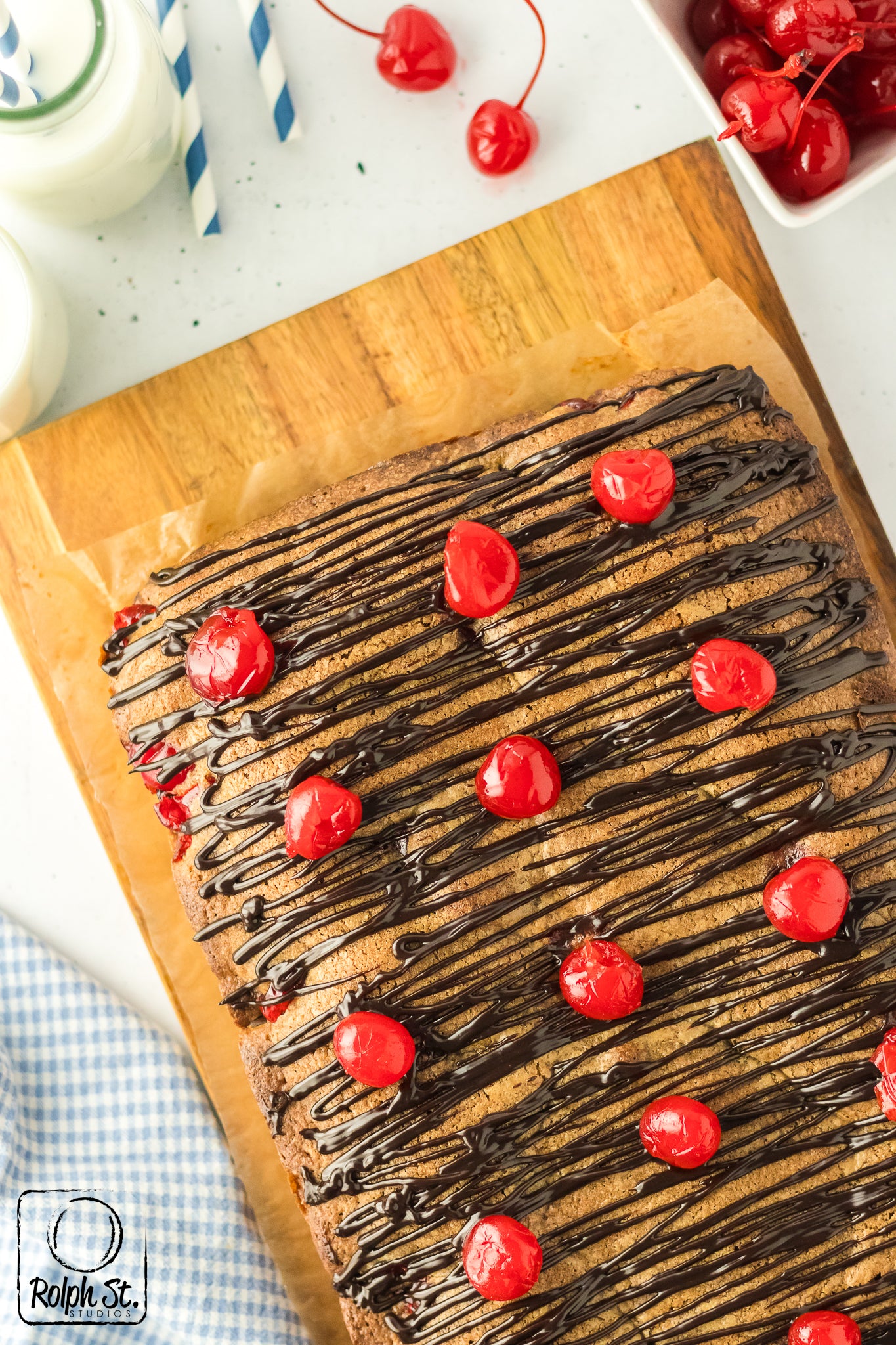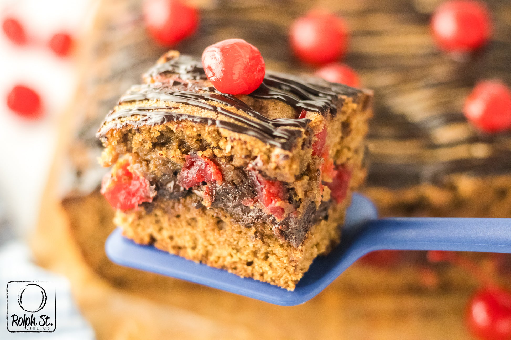 Chocolate Cherry Brownies come out of the pan as a decadent, layered treat that feels both indulgent and festive. The base is rich and fudgy, while pockets of melted chocolate chips add bursts of gooey sweetness throughout. Juicy maraschino cherries are scattered between the layers, their vibrant red colour peeking through the dark brownie and offering a playful pop of flavour that balances the richness with a fruity brightness. Once cooled, the glossy drizzle of chocolate ganache sets into a smooth, elegant topping, giving the brownies a polished finish. Each slice reveals a mosaic of chocolate and cherries—a perfect blend of bakery-style indulgence and rich chocolate.