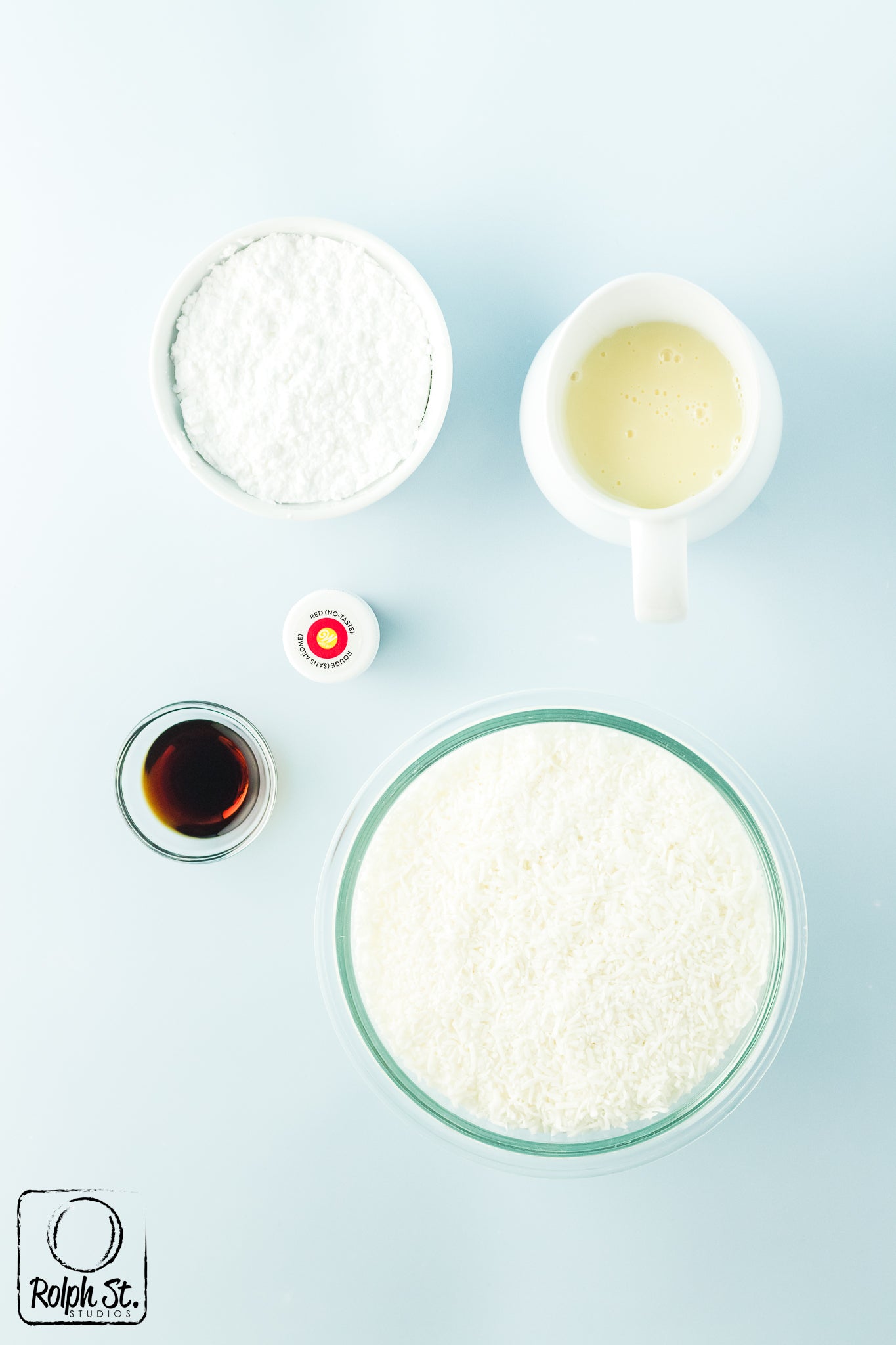 Main ingredients: coconut, powdered sugar, sweetened condensed milk, vanilla extract