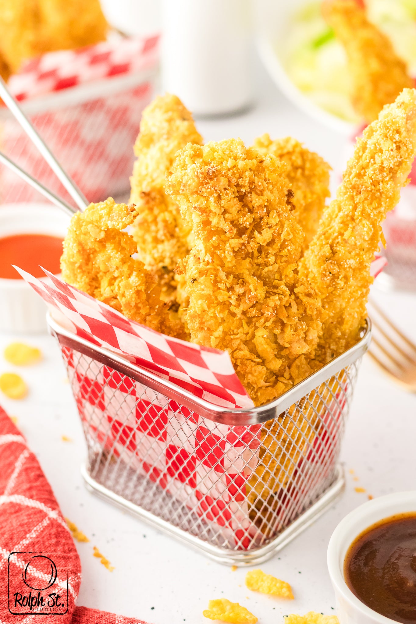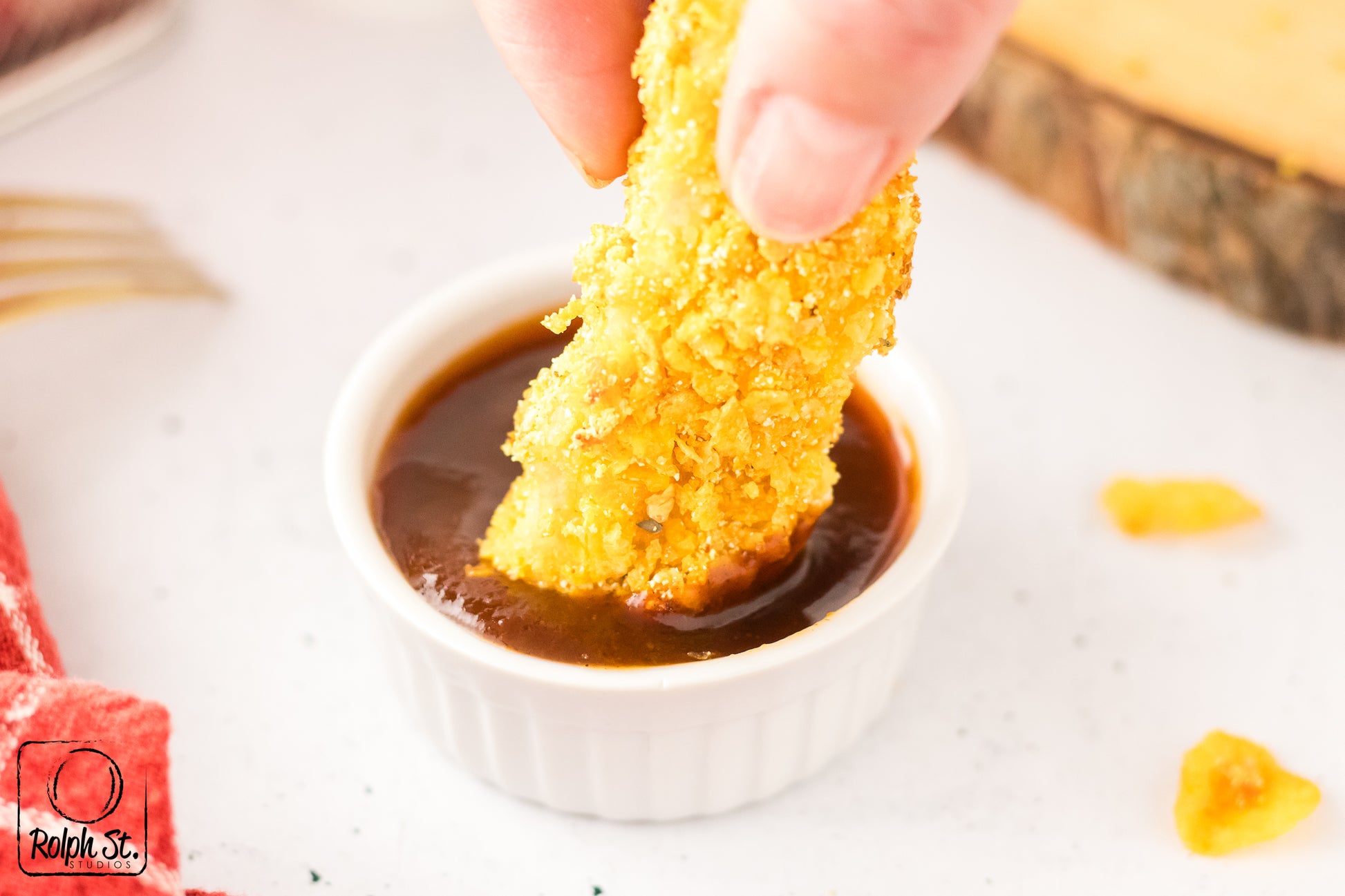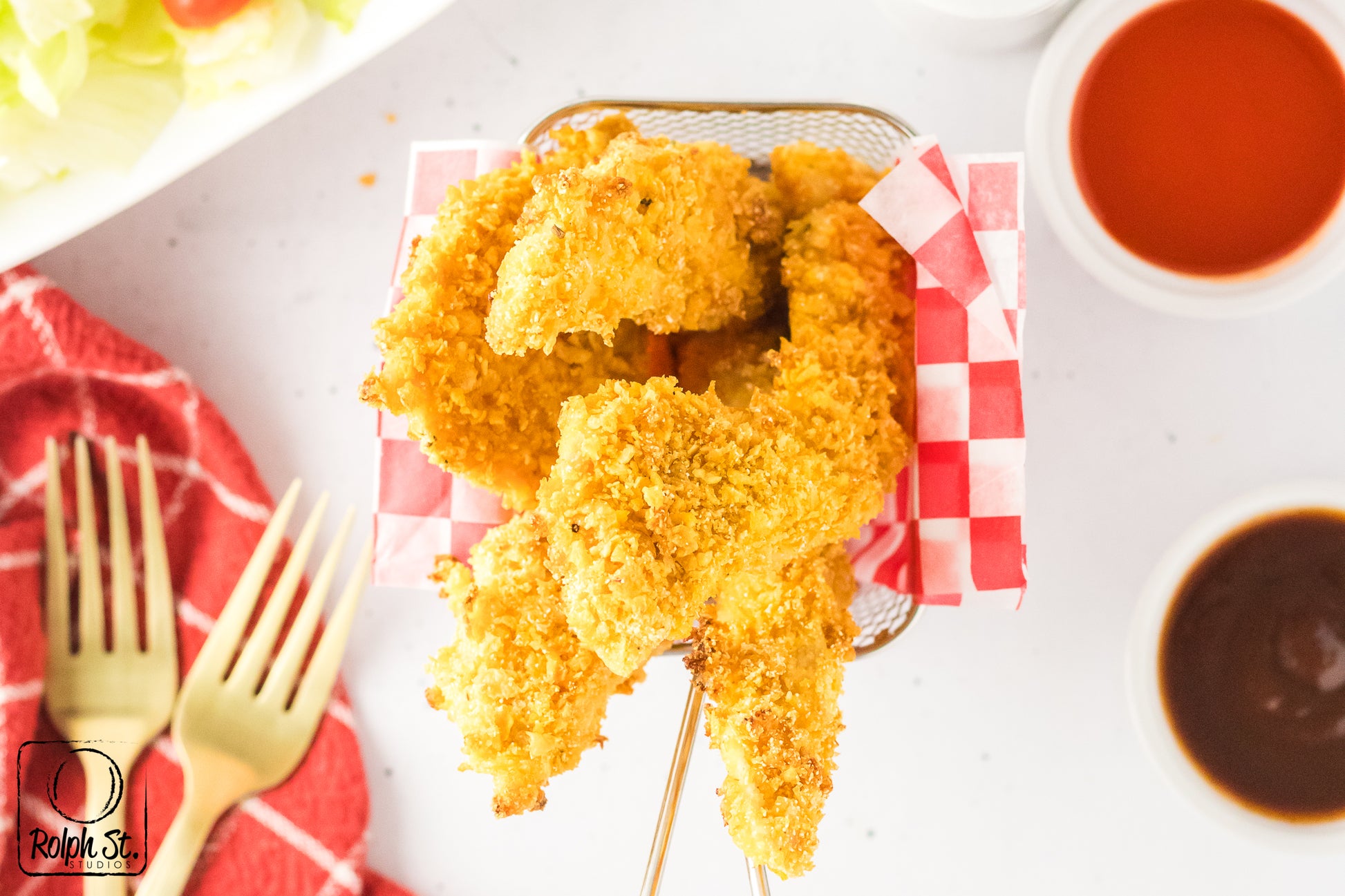 Cornflake Chicken Strips are a crispy, oven-baked twist on classic breaded chicken tenders. Instead of using breadcrumbs, these strips are coated in crushed corn flakes, which gives them a golden, crunchy exterior and a subtle sweetness. The result is juicy chicken with a crackly, satisfying crunch, perfect for dipping! This is a slightly healthier alternative to a traditional chicken strip meal and a really fun way to elevate weeknight dinners.