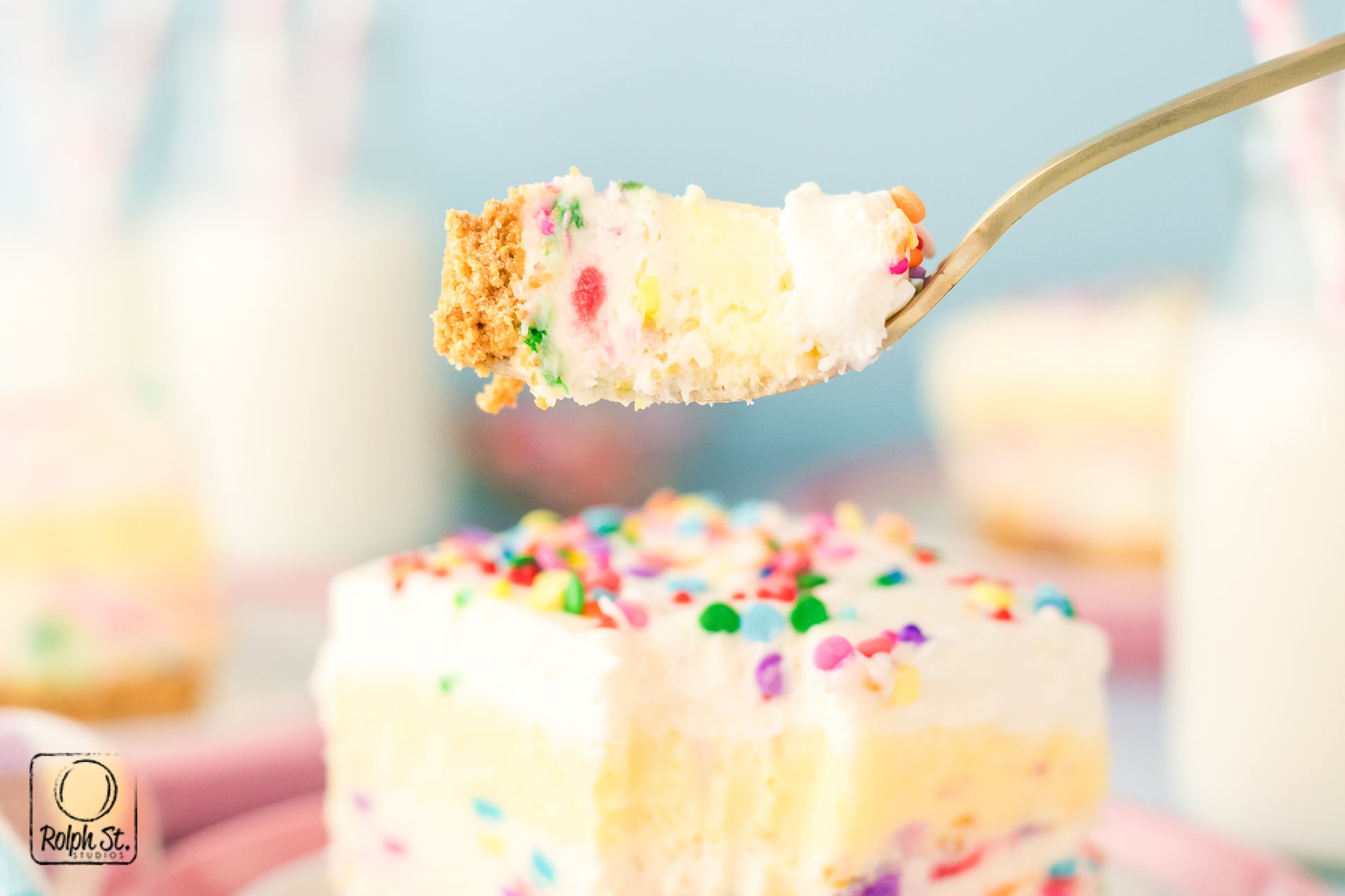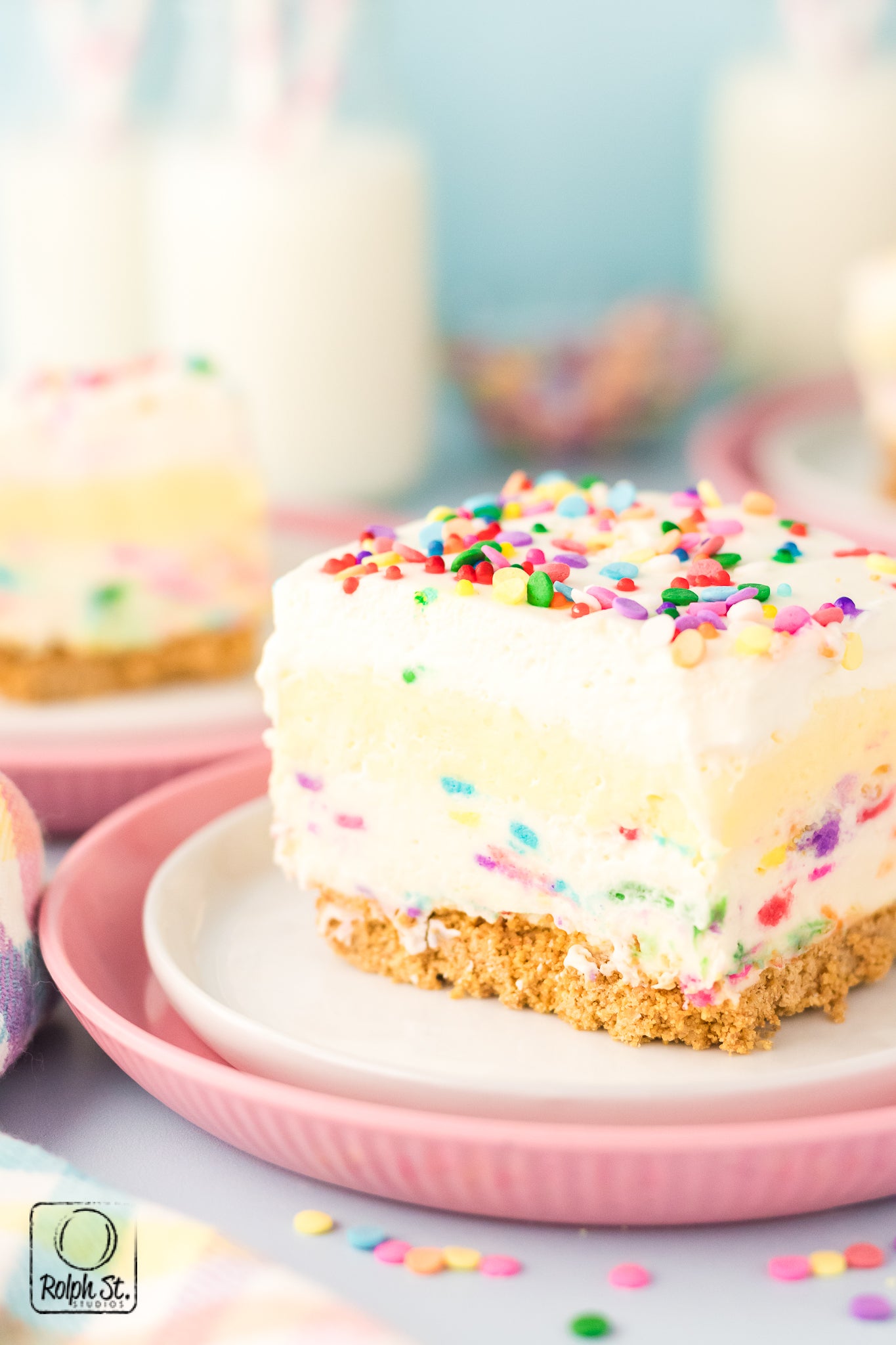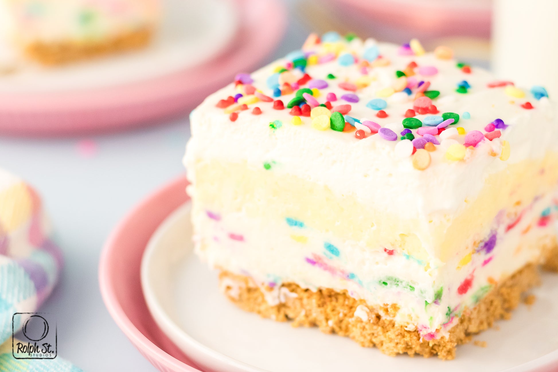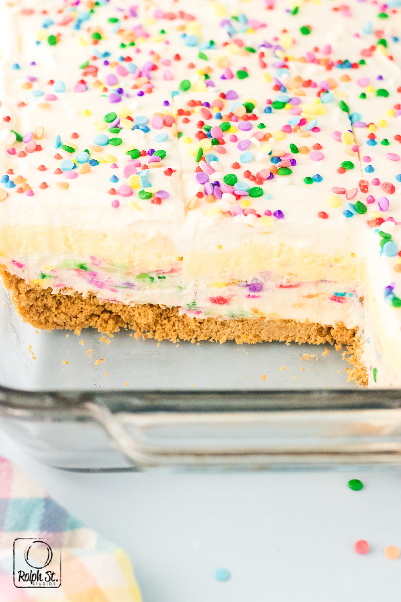 Funfetti Lush is a no-bake dessert that looks like a celebration! It is bright, creamy, irresistibly layered and so much fun! It starts with a classic graham cracker crust that’s buttery and slightly sweet. On top sits a thick, velvety cream cheese layer that’s sweet, smooth, and light, all speckled with rainbow sprinkles that give it a fun, confetti‑cake vibe. The next layer adds a rich, silky vanilla pudding cream that settles into a perfectly smooth blanket over the cheesecake filling, making each bite extra luscious. A final layer of whipped topping finishes the whole dessert and decorated with more sprinkles for a cheerful, party‑ready look. Once chilled, the layers slice beautifully, creamy, colourful, and indulgent without feeling heavy. It’s the kind of dessert that makes people smile before they even take a bite.