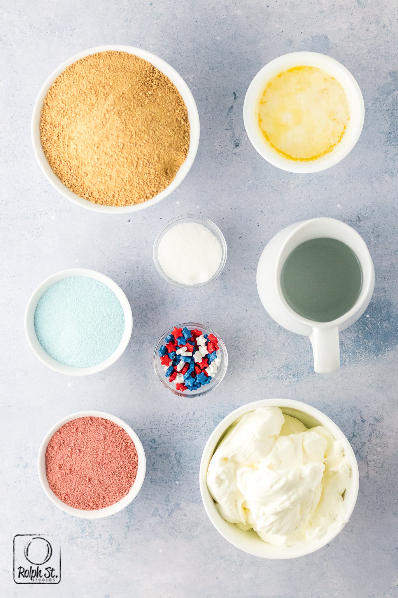 Main ingredients: red jello, blue jello, whipped cream, graham cracker crumbs, butter, sugar, water