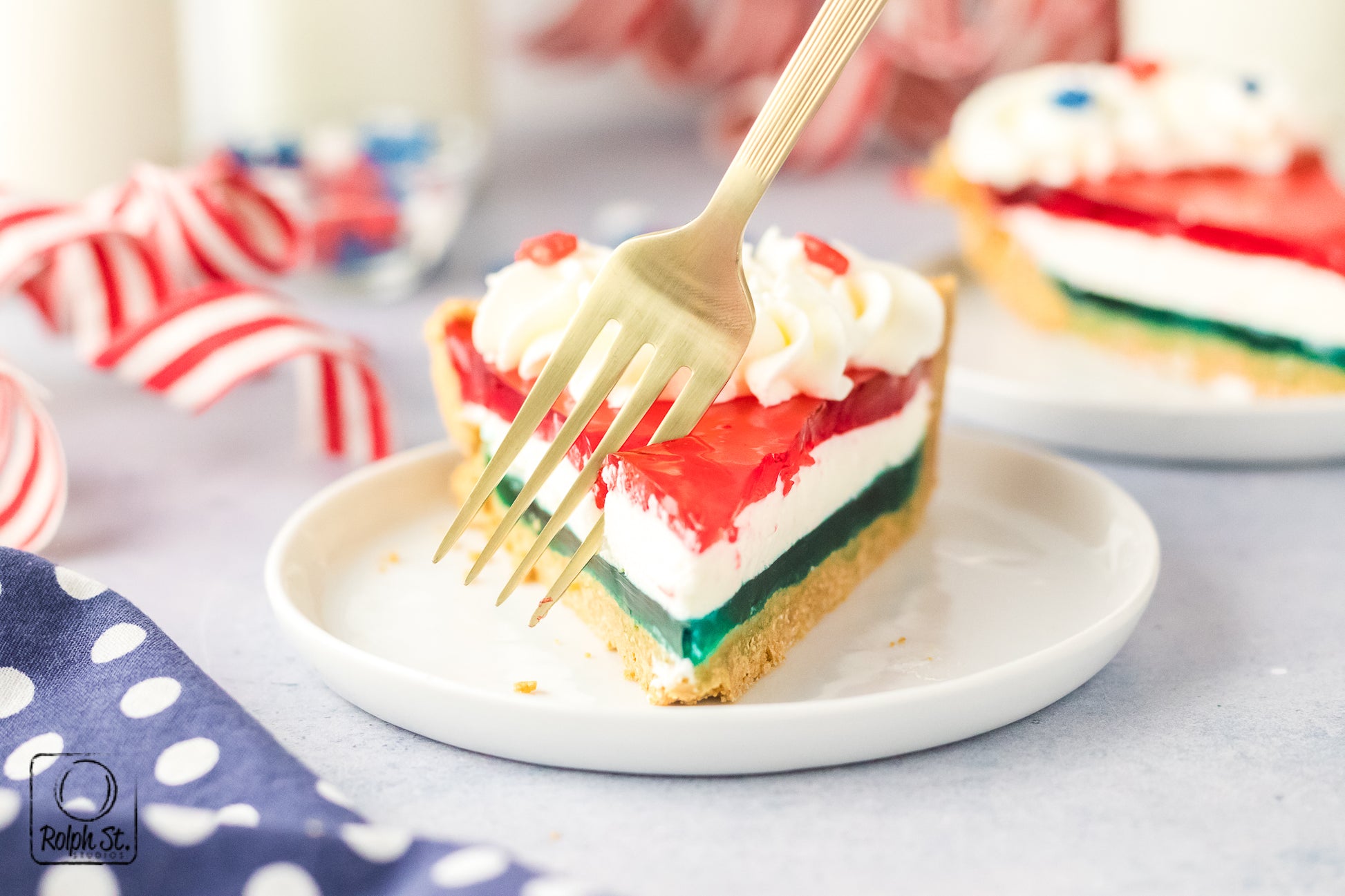 Patriotic Pie is the perfect Fourth of July dessert because it delivers all the celebration of Independence Day without ever turning on the oven. As a completely no-bake treat, it comes together easily so you can relax on the holiday. The jello and whipped cream layers create a cool and refreshing slice that not only tastes great but looks spectacular. It’s the kind of dessert that you can prepare a day ahead, chill and unveil when dessert time comes around. Simple, celebratory and absolutely eye-catching, this dessert will be the star of your dessert table.