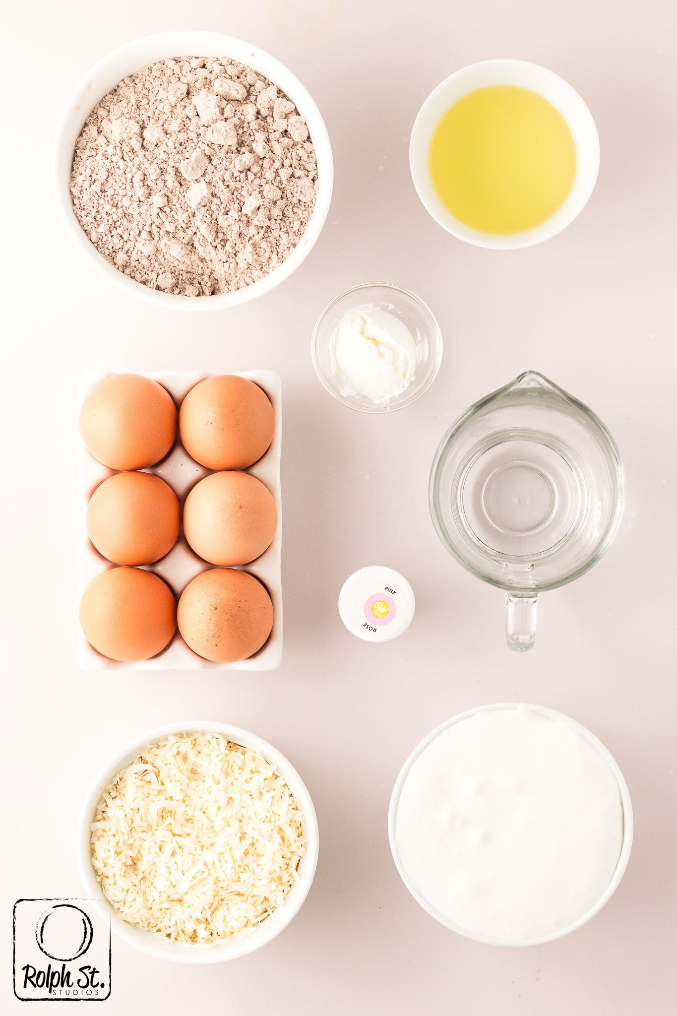 Main ingredients: brownie mix (plus the ingredients to make the brownies), marshmallow fluff, corn starch, coconut, pink food colouring