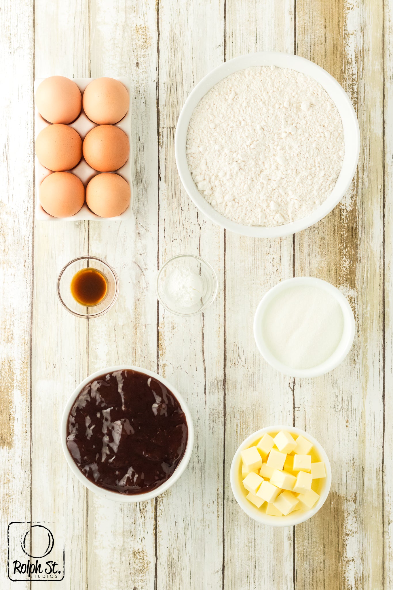 Main ingredients: strawberry jam, all purpose flour, butter, eggs, granulated sugar