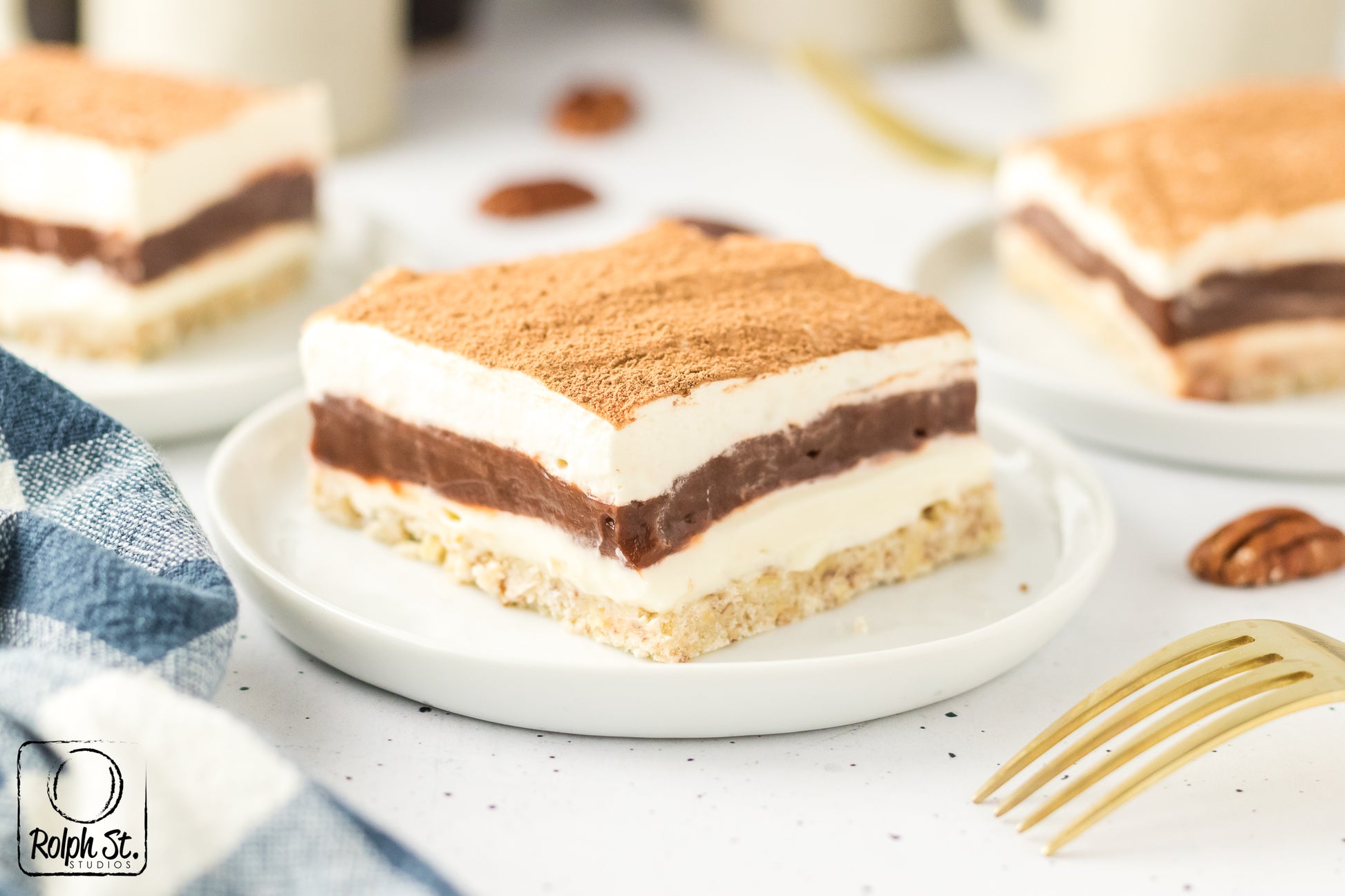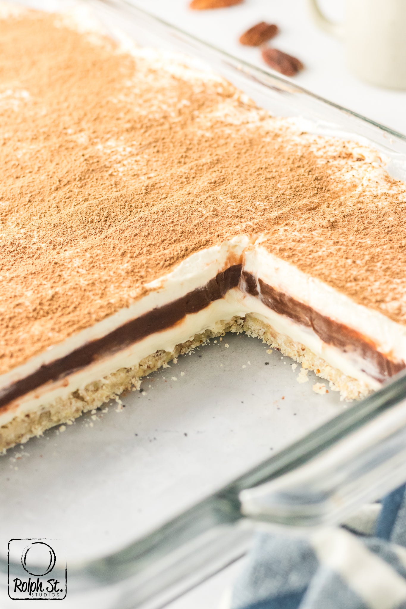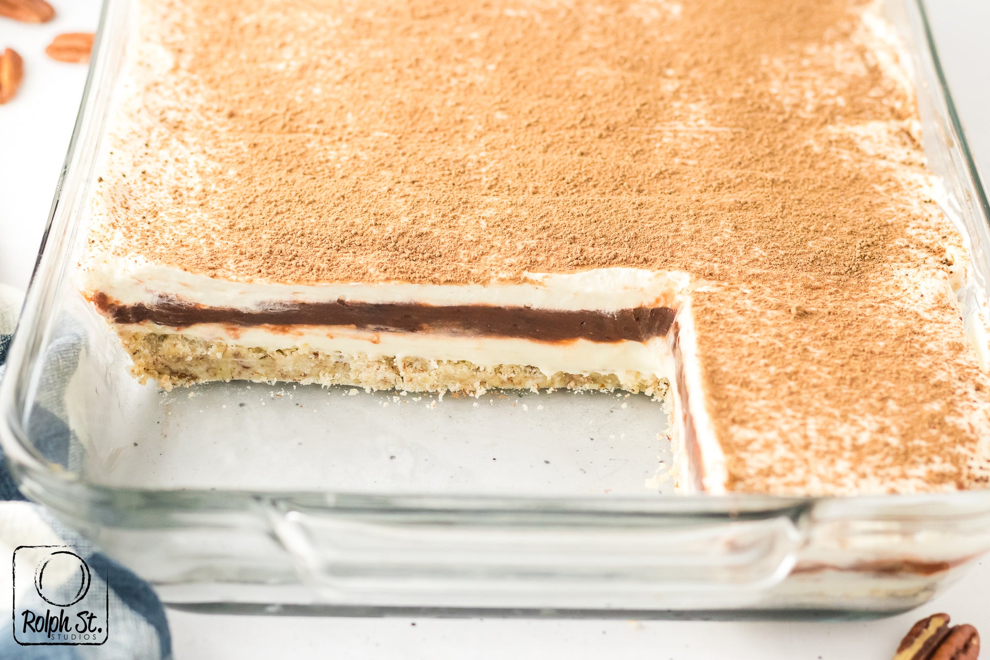 Main ingredients: pecans, cream cheese, powdered sugar, chocolate pudding mix, vanilla pudding mix, heavy cream