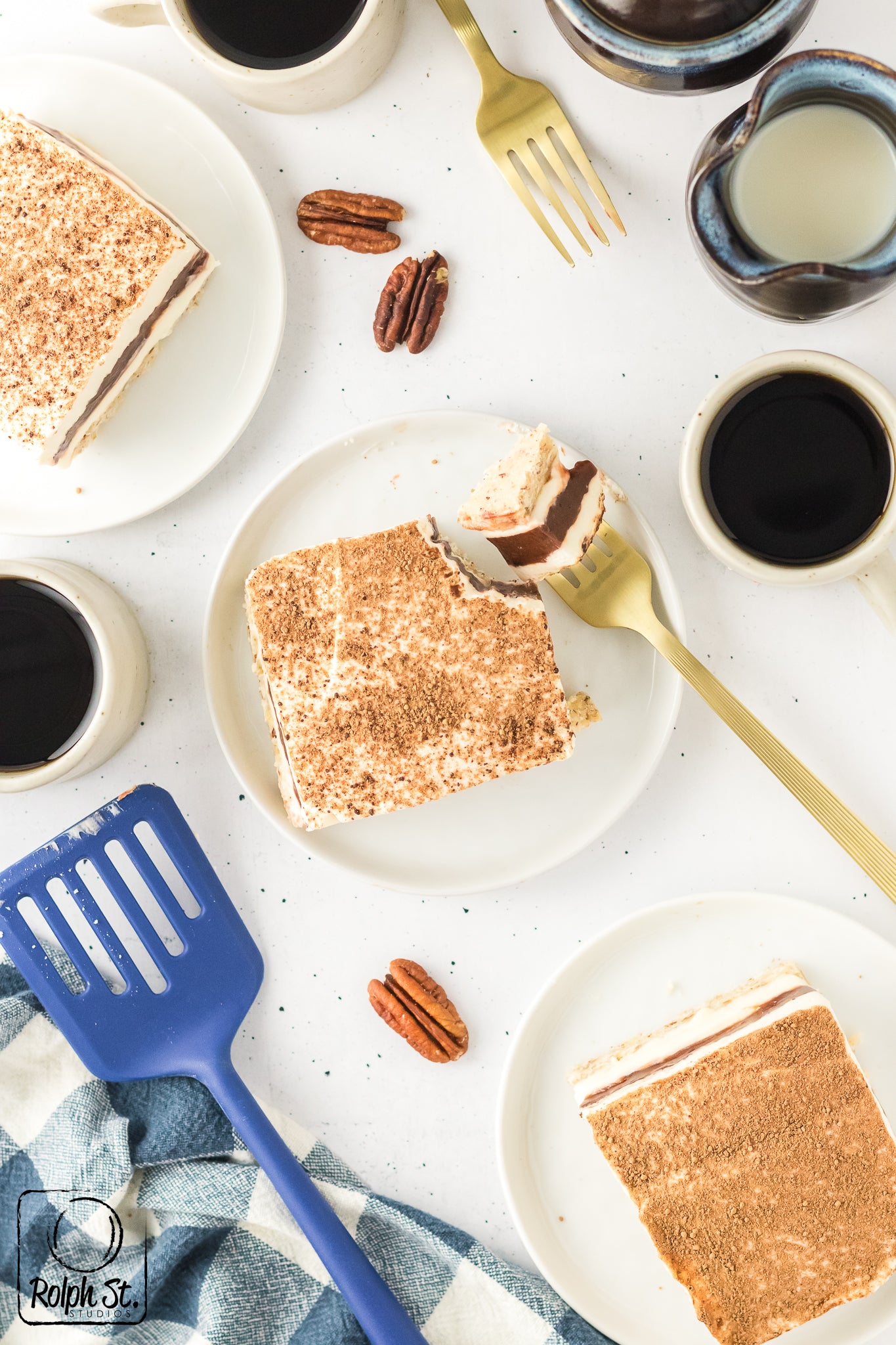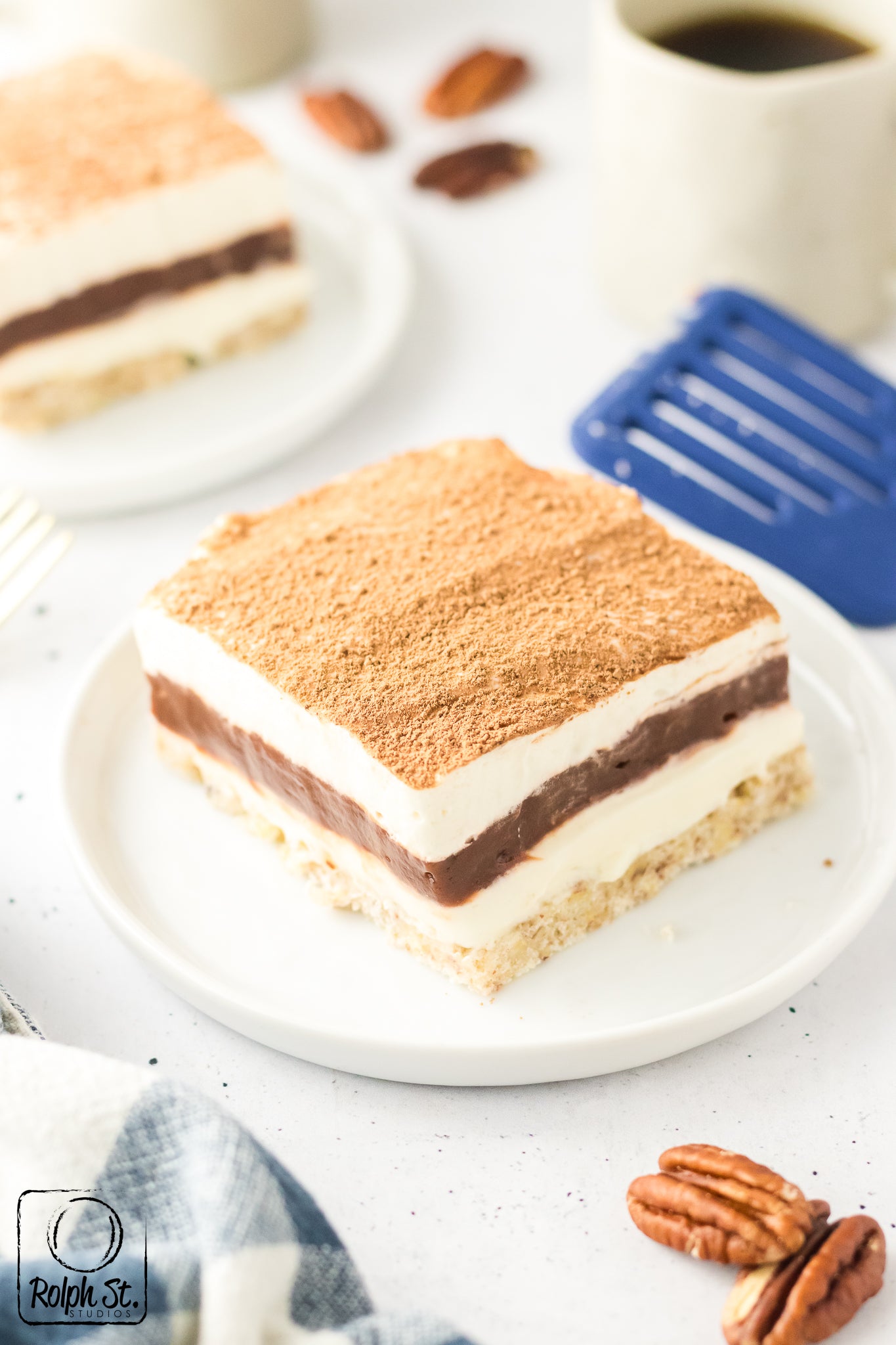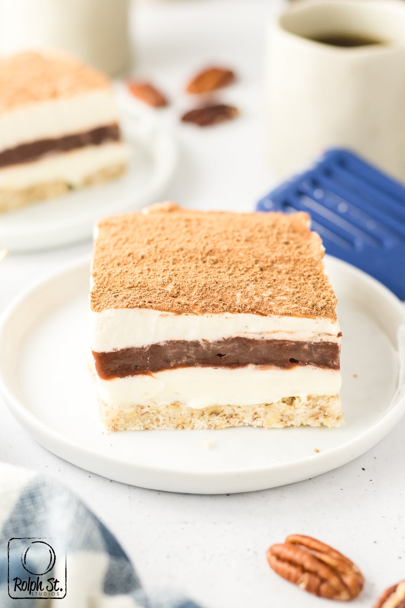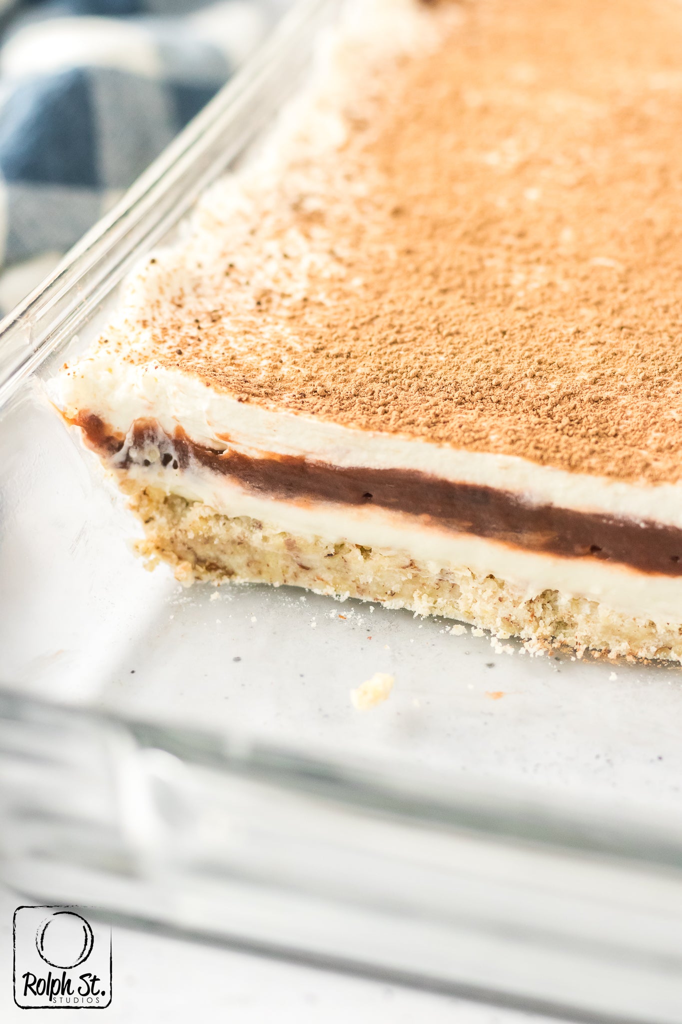 Main ingredients: pecans, cream cheese, powdered sugar, chocolate pudding mix, vanilla pudding mix, heavy cream
